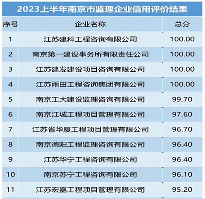 喜訊!宏嘉公司在2023年上半年南京市建設(shè)工程監(jiān)理企業(yè)信用評價評比中取得全市第11名佳績